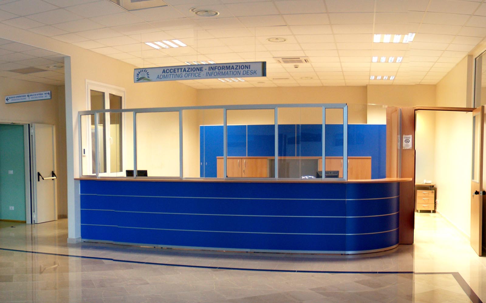 L’edificio è dislocato su tre piani fuori terra e un piano interrato. La soluzione scelta di forma rettangolare è risultata essere la più congeniale perché tale configurazione ha permesso di mantenere un perfetto equilibrio tra funzioni sanitarie di base e specifiche, distribuzioni di spazi a servizio del personale e visitatori, area amministrativa e un connettivo che permettesse una perfetta e congeniale comunicazione tra i vari ambienti.