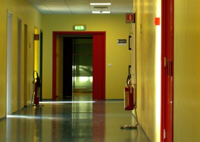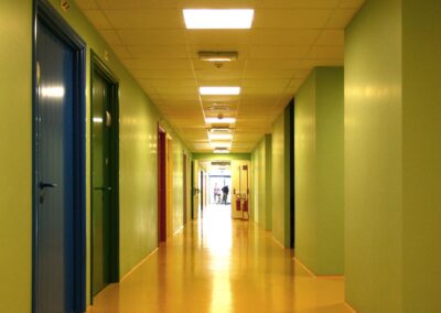 Particolare attenzione è stata dedicata alla progettazione dei percorsi interni e delle finiture: sono stati previsti percorsi specifici per ogni tipo di utilizzatore (personale, pazienti, visitatori, movimento dei materiali) in modo da non creare interferenze e garantire un’assoluta privacy. Pertanto l’edificio è suddiviso in unità funzionali sanitarie e zone comuni condominiali.